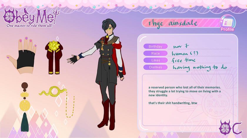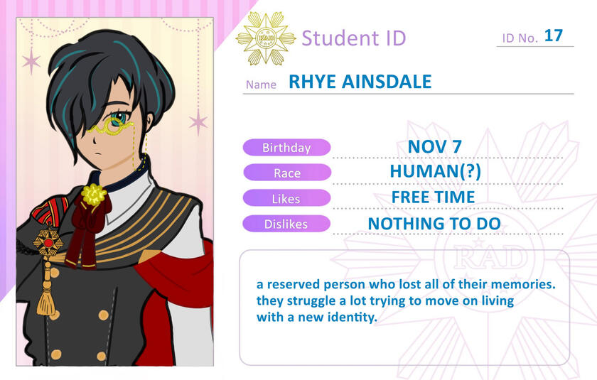 rhye has been amnesiac since the time before they were sent to devildom. adopted by a single parent, rhye spent their days helping out in the bookstore cafe for as long as they could remember. their upbringing influenced their introverted behaviour, often seeming reserved except for when they are with their adopted father and sister. even though they don't mention it a lot, rhye misses them very dearly.
